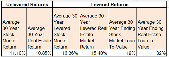 What’s notable here is that the unlevered returns is that the average stock market unlevered returns are only 25 basis points higher than the average 30 year real estate investing IRR. But leverage makes the stock market returns 100 basis points better.